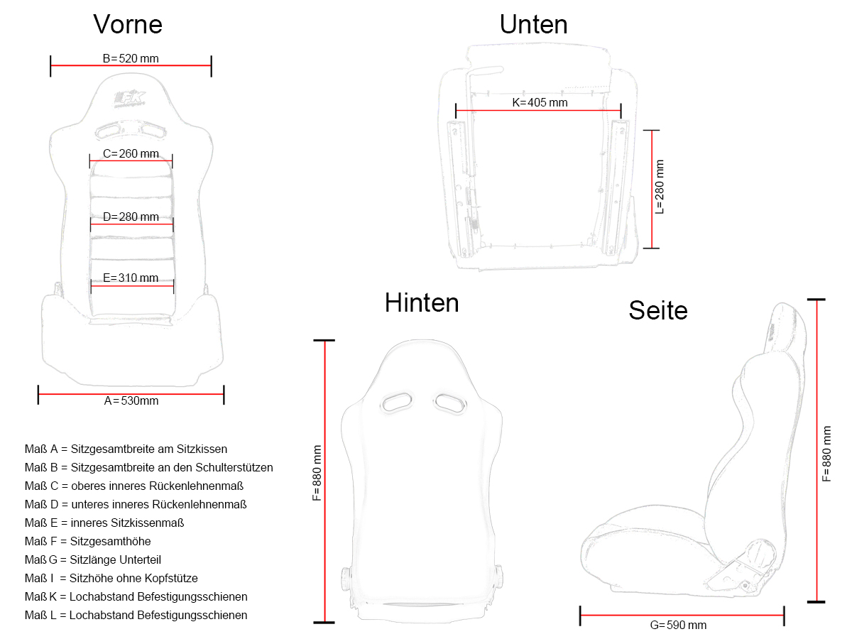 Farbe: schwarz/weißHalbschalensitzeSet aus 1 linker + 1 rechter Sitzinkl. LaufschienenRückenlehne manuell verstellbarmit Klappmechanismusohne Teilegutachten/StVZO-ZulassungBezug: Kunstlederauch in schwarz/rot u.v.m.Farbe: schwarz/weißHalbschalensitzeSet aus 1 linker + 1 rechter Sitzinkl. LaufschienenRückenlehne manuell verstellbarmit Klappmechanismusohne Teilegutachten/StVZO-ZulassungBezug: Kunstlederauch in schwarz/rot u.v.m.